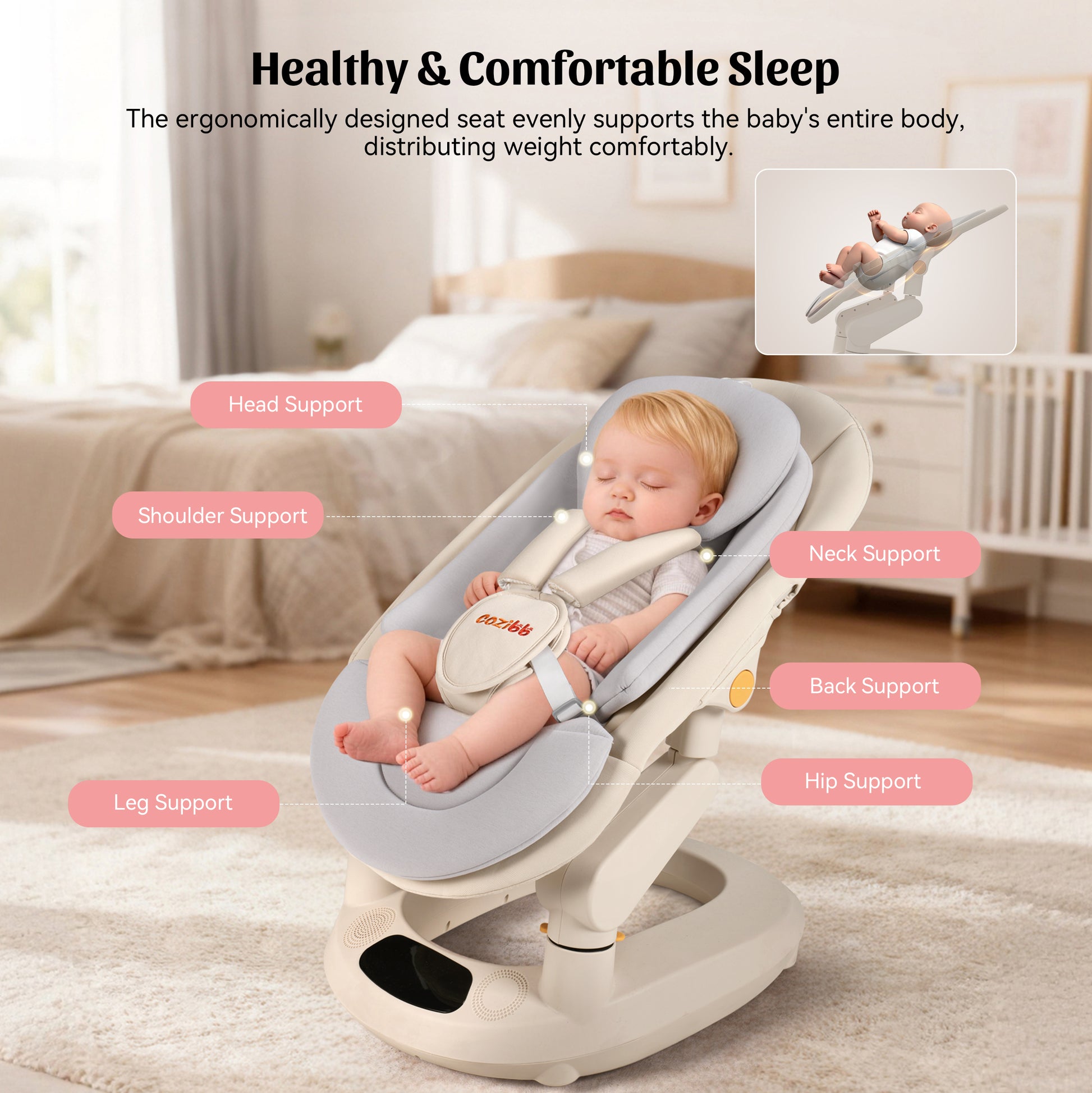 FULL-BODY ERGONOMIC SUPPORT :Unlike ordinary baby rockers, Cozibb features a contoured seat with 6-point support from head to legs, helping distribute weight evenly and maintain a natural resting posture.